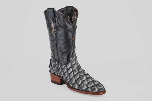 Step into the wild west with the Conor - Matte Black - Roper Toe cowboy boots. Crafted from unique pirarucu fish leather, these boots blend rugged style with a touch of sophistication. Perfect for your next adventure or a night out, they offer comfort and a standout look that defines casual western charm. Elevate your footwear collection with a pair that embodies boldness and individuality.